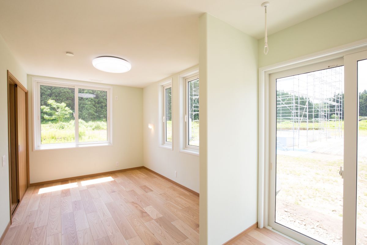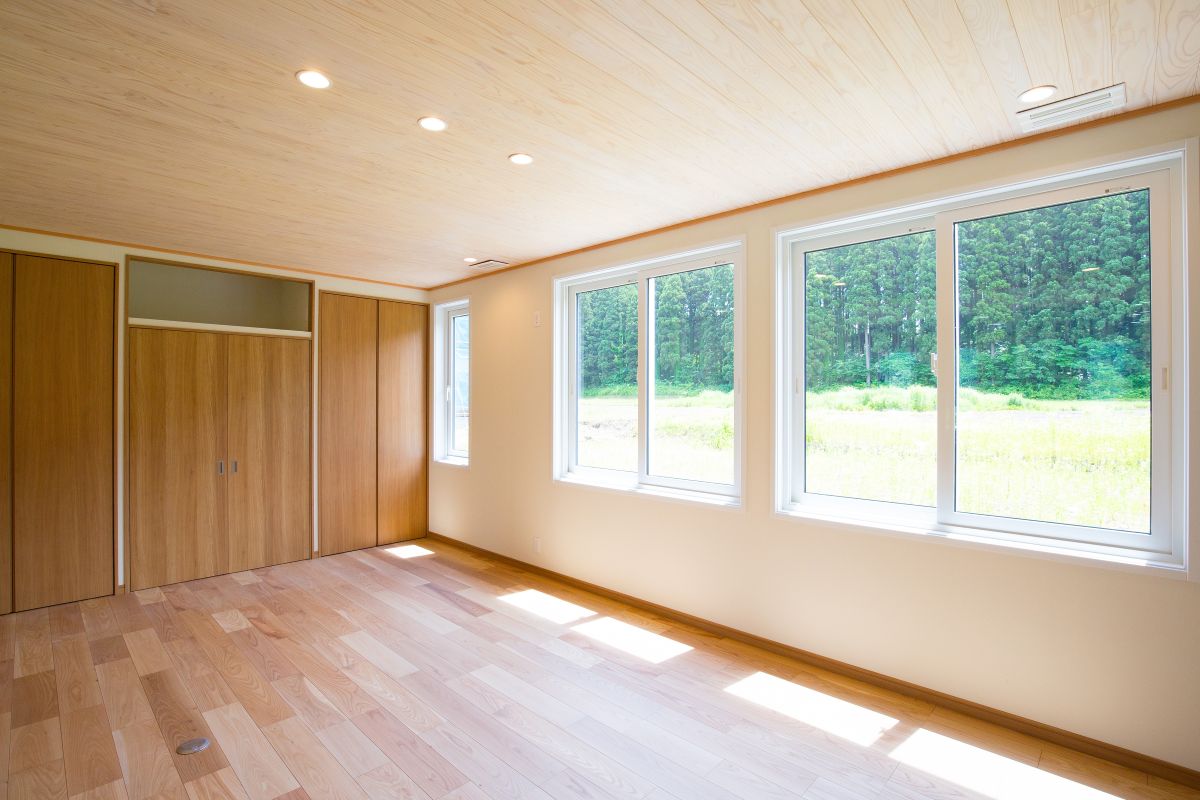 田園と森を望む南側の壁面には、その風景を日々の暮らしに取り入れる大きな窓を配置。こだわりの生活空間のなかで、季節によって変化していく自然の風景を楽めるゆとりの家。